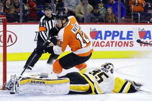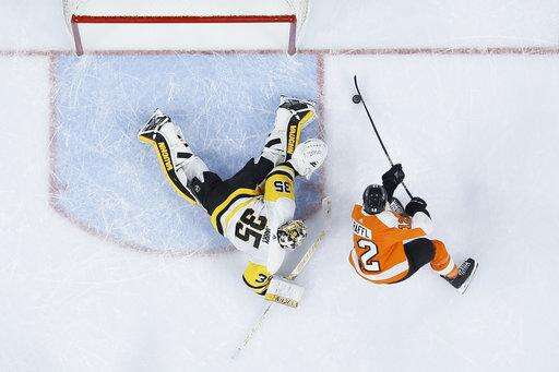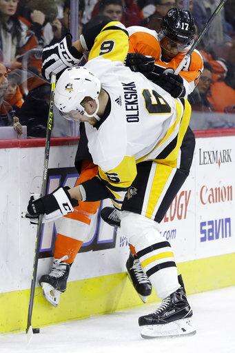 NOTES: Penguins defensemen Kris Letang and Justin Schultz returned from injuries. Letang had missed the last three games and Schultz had missed 11 because of undisclosed injuries. ... Philadelphia Eagles coach Doug Pederson received a huge ovation when he was introduced in the first period. ... The Flyers' bench door appeared to break in the third. ... Oleksiak scored his first goal for Pittsburgh since he was acquired last month from Dallas. ... Crosby has 40 points (16 goals, 24 assists) in 29 career games at Philadelphia. ... Penguins defenseman Brian Dumoulin and forward Carter Rowney also were injured.