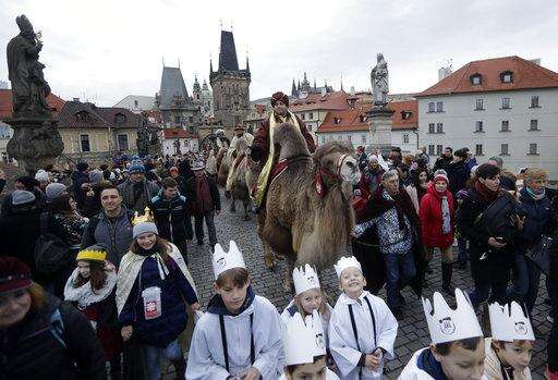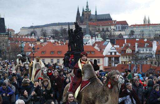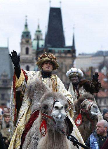 Men dressed as the Three Kings ride on camels during a procession of the Three Kings across the Charles Bridge in Prague, Czech Republic, Friday, Jan. 5, 2018. The procession, which annually marks the end of the Christmas festivities in Prague, is a re-enactment of the journey of the Three Kings to visit the infant Jesus. Prague Castle is in the background. (AP Photo/Petr David Josek)