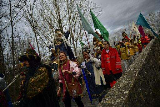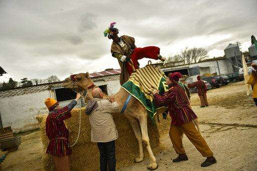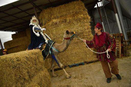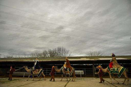 Tree Kings of The Cabalgata Los Reyes Magos (Cavalcade of the three kings) prepare to take part during the cavalcade the day before Epiphany, in Pamplona, northern Spain, Friday, Jan. 5, 2018. The parade symbolizes the coming of the Magi to Bethlehem following the birth of Jesus, marked in Spain and many Latin American countries Epiphany is the day when gifts are exchanged. (AP Photo/Alvaro Barrientos)