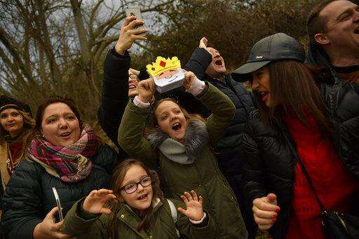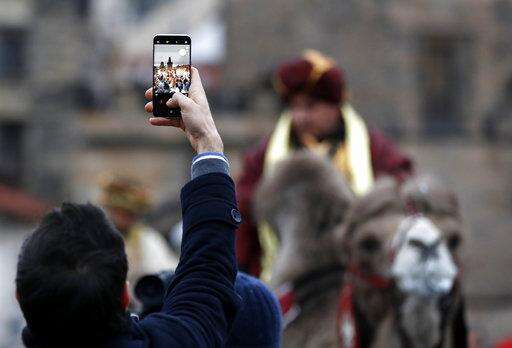A man takes a photo of a procession of the Three Kings marching across the Charles Bridge in Prague, Czech Republic, Friday, Jan. 5, 2018. The procession, which annually marks the end of the Christmas festivities in Prague, is a re-enactment of the journey of the Three Kings to visit the infant Jesus. (AP Photo/Petr David Josek)