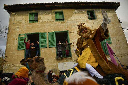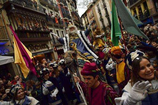 One king of The Cabalgata Los Reyes Magos (Cavalcade of the three kings) waves to people during the cavalcade the day before Epiphany, in Pamplona, northern Spain, Friday, Jan. 5, 2018. The parade symbolizes the coming of the Magi to Bethlehem following the birth of Jesus marked in Spain and many Latin American countries Epiphany is the day when gifts are exchanged. (AP Photo/Alvaro Barrientos)