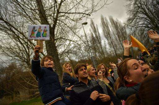 Tree Kings of The Cabalgata Los Reyes Magos (Cavalcade of the three kings) waves people as they cross a bridge during the cavalcade the day before Epiphany, in Pamplona, northern Spain, Friday, Jan. 5, 2018. The parade symbolizes the coming of the Magi to Bethlehem following the birth of Jesus, marked in Spain and many Latin American countries Epiphany is the day when gifts are exchanged. (AP Photo/Alvaro Barrientos)