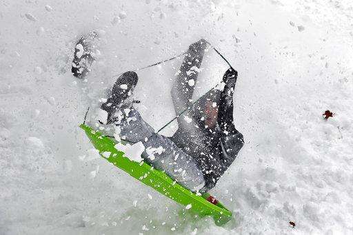 Dillon Utter loses control of his sled while sliding down a hill on Fort Monroe Thursday, Jan. 4, 2018, in Hampton, Va. Virginia has been socked by a powerful winter blast of snow and cold that's seldom seen along its coast. (Jonathon Gruenke /The Daily Press via AP) The Associated Press