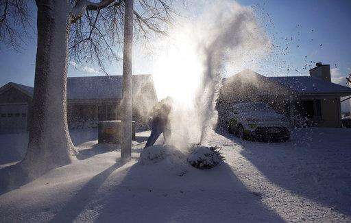 In the late afternoon light, Thursday, Jan. 4, 2018, Ida Church works to clear her sidewalk using an electric snow blower shovel in Virginia Beach, Va. A massive winter storm swept from the Carolinas to Maine on Thursday, dumping snow along the coast and bringing strong winds that will usher in possible record-breaking cold. (L. Todd Spence /The Virginian-Pilot via AP) The Associated Press