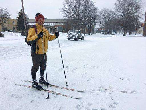 Mark Schoenenberger, 45, a NASA engineer who lives in Norfolk, Va., skis to get bagels for his family on Jan. 4, 2018. Virginia got socked Thursday, Jan. 4, 2018, by a powerful winter blast of snow and cold that's seldom seen along its coast, with tens of thousands of residents losing power, more than 100 drivers stalling or crashing on roads and at least one man strapping on skis to get bagels for his family. (AP Photo / Ben Finley) The Associated Press