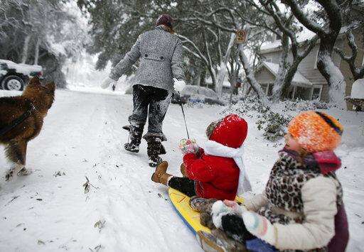 Katie Cerqua takes her daughters Iris, 3, center, and Hazel, 7, for a ride through their neighborhood in Virginia Beach, Va., Thursday, Jan. 4, 2018. A massive winter storm swept from the Carolinas to Maine on Thursday, dumping snow along the coast and bringing strong winds that will usher in possible record-breaking cold. (Stephen M. Katz/The Virginian-Pilot via AP) The Associated Press