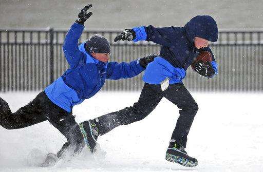 Nathan Cochran, 10, attempts to grab Jackson Robbins, 10, as they play football in the snow on Thursday, Jan. 4, 2018, in Newport News, Va. The National Weather Service issued a winter weather advisory for the upper part of the Peninsula and much of the Middle Peninsula. The advisory, issued around 1 p.m. Thursday, warns of snow, blowing snow and slippery roads until 6 p.m. (Aileen Devlin/The Daily Press via AP) The Associated Press