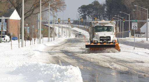 A snow plow works to clear snow from City Center Boulevard, in Newport News, Va., Thursday, Jan. 4, 2018. (Adrin Snider /The Daily Press via AP) The Associated Press