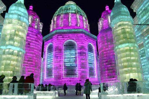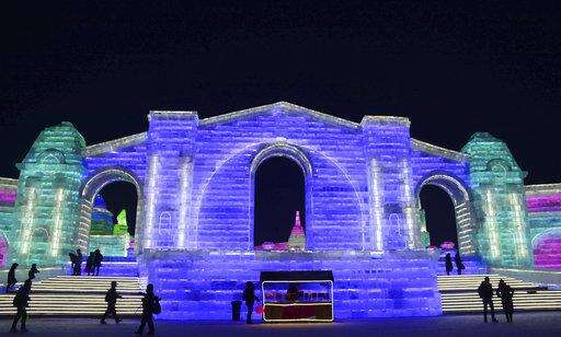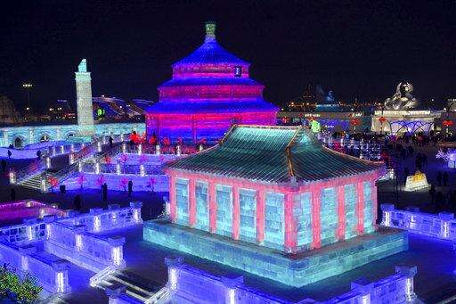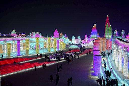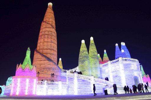 FILE - In this Jan. 2, 2018 photo, visitors walk among the attractions at the Harbin International Ice and Snow Festival in Harbin in northeastern China's Heilongjiang Province. The Harbin International Ice and Snow Festival is known for massive, elaborate and colorfully lit ice sculptures featuring animals, cartoon characters and famous landmarks. (Chinatopix via AP, File)