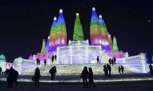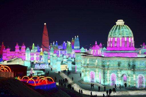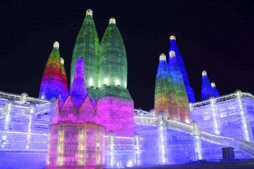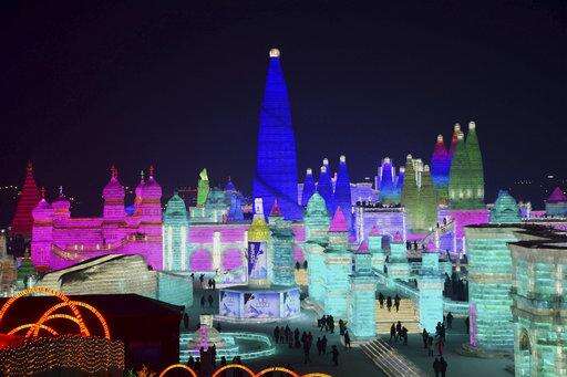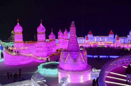 In this Jan. 2, 2018 photo, the attractions are lit at the Harbin International Ice and Snow Festival in Harbin in northeastern China's Heilongjiang Province. The Harbin International Ice and Snow Festival is known for massive, elaborate and colorfully lit ice sculptures featuring animals, cartoon characters and famous landmarks. (Chinatopix via AP)