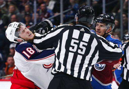 Colorado Avalanche left wing Blake Comeau (14) hits Columbus Blue Jackets center Pierre-Luc Dubois (18) while linesman Shane Heyer (55) tries to beak up the fight during the first period of an NHL hockey game Thursday, Jan. 4, 2018, in Denver. (AP Photo/Jack Dempsey) The Associated Press