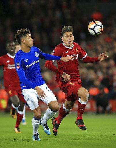 Liverpool's Roberto Firmino, right, and Everton's Mason Holgate chase the ball during the English FA Cup Third Round soccer match between Liverpool and Everton at Anfield in Liverpool, England, Friday, Jan. 5, 2018. (Peter Byrne//PA via AP) The Associated Press
