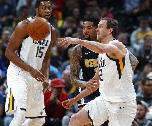 Utah Jazz forward Joe Ingles, front right, of Australia, passes the ball in front of Denver Nuggets forward Wilson Chandler in the first half of an NBA basketball game Friday, Jan. 5, 2018, in Denver. (AP Photo/David Zalubowski) The Associated Press