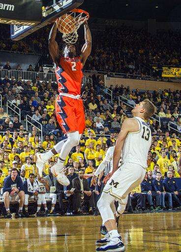 Illinois forward Kipper Nichols (2) dunks the ball as Michigan forward Moritz Wagner (13) watches in the first half of an NCAA college basketball game at Crisler Center in Ann Arbor, Mich., Saturday, Jan. 6, 2018. (AP Photo/Tony Ding) The Associated Press
