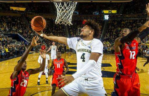 Michigan forward Isaiah Livers (4) goes to the basket, as Illinois guard Da'Monte Williams (20) and forward Leron Black (12) defend in the first half of an NCAA college basketball game at Crisler Center in Ann Arbor, Mich., Saturday, Jan. 6, 2018. Michigan won 79-69. (AP Photo/Tony Ding) The Associated Press
