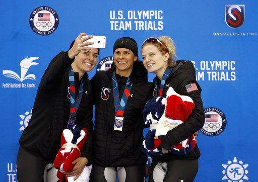 Second place finisher Heather Bergsma, left, takes selfie with first place finisher Brittany Bowe, center, third place finisher Mia Manganello, right, during a medal ceremony following women's 1,500 meters during the U.S. Olympic long track speedskating trials, Saturday, Jan. 6, 2018, in Milwaukee. (AP Photo/John Locher) The Associated Press