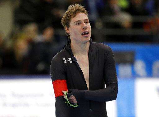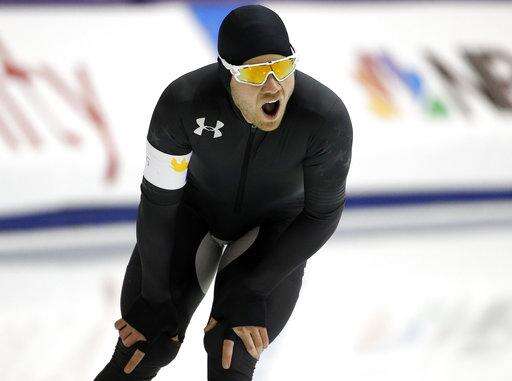 Joey Mantia reacts after competing in the men's 1,500 meters during the U.S. Olympic long track speedskating trials, Saturday, Jan. 6, 2018, in Milwaukee. (AP Photo/John Locher) The Associated Press