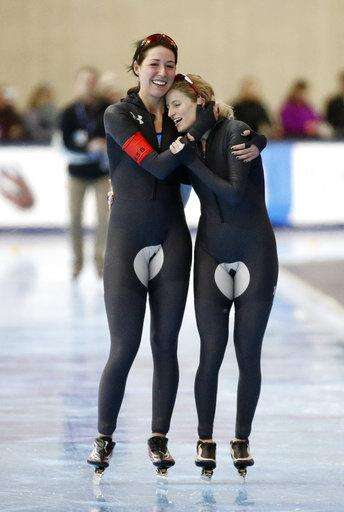 Mia Manganello, right, is congratulated by Petra Acker after competing in the women's 1,500 meters during the U.S. Olympic long track speedskating trials, Saturday, Jan. 6, 2018, in Milwaukee. (AP Photo/John Locher) The Associated Press