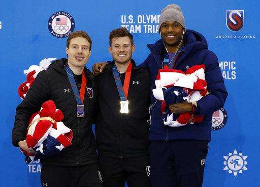 First place finisher Joey Mantia, center, poses for photos with second place finisher Brian Hansen, left, and third place finisher Shani Davis, right, during a medal ceremony following the men's 1,500 meters during the U.S. Olympic long track speedskating trials, Saturday, Jan. 6, 2018, in Milwaukee. (AP Photo/John Locher) The Associated Press