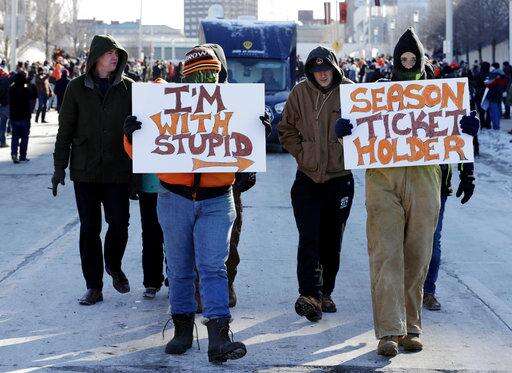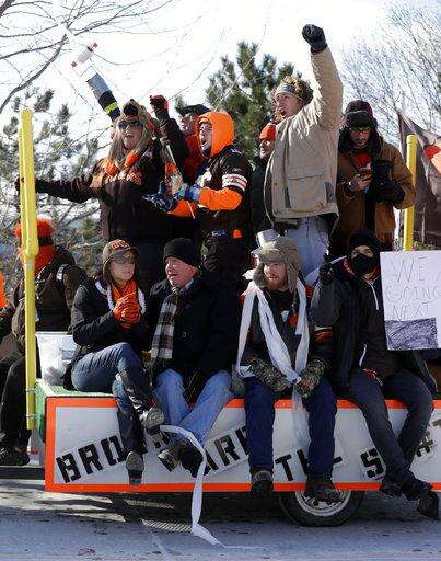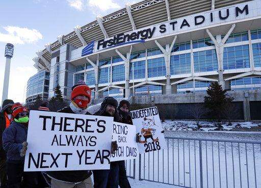 Despite wind chills below zero, fans lined the street around FirstEnergy Stadium, which has been dubbed the "Factory of Sadness" in recent years, to cheer as 80 vehicles, a rock band on a flatbed truck and a group carrying 28 tombstones to represent the team's 28 starting quarterbacks since 1999, took a "no victory" lap.