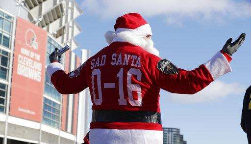 A Cleveland Browns fan dressed as Santa Claus participates in the "Perfect Season" parade, Saturday, Jan. 6, 2018, in Cleveland. The Browns became the second team in NFL history to lose 16 games in a season. In joining the 2008 Detroit Lions in a shameful loser's club, the Browns have found a new low in what has been nearly two decades of disgrace since returning as an expansion franchise in 1999. (AP Photo/Tony Dejak) The Associated Press