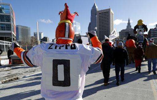 A Cleveland Browns fan walks in the "Perfect Season" parade, Saturday, Jan. 6, 2018, in Cleveland. The Browns became the second team in NFL history to lose 16 games in a season. In joining the 2008 Detroit Lions in a shameful loser's club, the Browns have found a new low in what has been nearly two decades of disgrace since returning as an expansion franchise in 1999. (AP Photo/Tony Dejak) The Associated Press