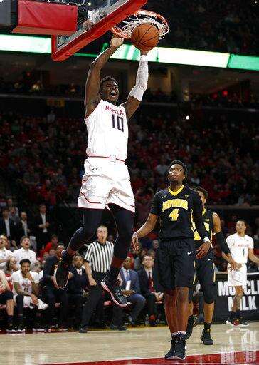 Freshman Bruno Fernando scored a career-high 21 points, Anthony Cowan Jr. added 15 and Maryland pulled away to a 91-73 victory Sunday night to keep the Hawkeyes winless in the Big Ten.