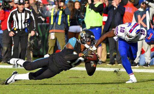 Trailing 10-3 with about six minutes to play, the Bills looked as if they picked up a first down on an 11-yard pass from Tyrod Taylor to Clay. Jacksonville players standing on the sideline pointed to Clay's feet, and coach Doug Marrone threw the challenge flag. Officials overturned the completion, saying Clay was out of bounds and setting up a third-and-10 play from the Jacksonville 48-yard line. Linebacker Myles Jack sacked Taylor on the next play, forcing a punt.