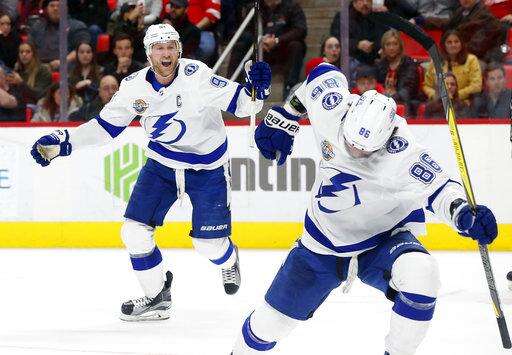 Tampa Bay Lightning right wing Nikita Kucherov, right, celebrates his goal against the Detroit Red Wings with Steven Stamkos (91) in the third period of an NHL hockey game Sunday, Jan. 7, 2018, in Detroit. (AP Photo/Paul Sancya)