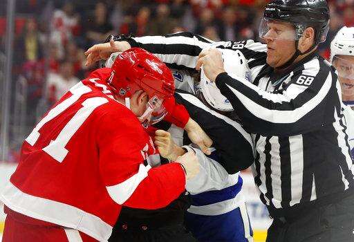 Linesman Scott Driscoll (68) tries to break up a fight between Detroit Red Wings center Dylan Larkin (71) and Tampa Bay Lightning center Brayden Point (21) in the first period of an NHL hockey game Sunday, Jan. 7, 2018, in Detroit. (AP Photo/Paul Sancya)
