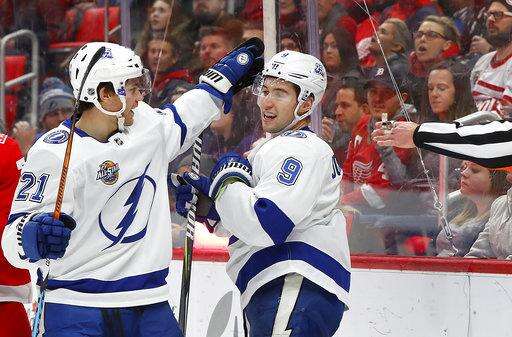 Tampa Bay Lightning center Tyler Johnson (9) celebrates his goal against the Detroit Red Wings with Brayden Point (21) in the first period of an NHL hockey game Sunday, Jan. 7, 2018, in Detroit. (AP Photo/Paul Sancya)