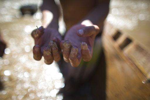 In this Nov. 29, 2017 photo, a river scavenger shows his fingers wrapped with scotch tape, as he digs for gold and anything of valuable he can sell, at the bottom of the polluted Guaire River that runs through Caracas, Venezuela. Scavengers say they often cut their fingers on the river's jagged bottom and their fingers get infected. (AP Photo/Ariana Cubillos)