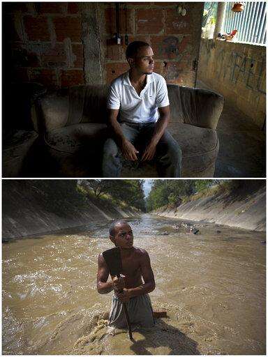 This combo of two photographs shows Angel Villanueva in his living room on Dec. 9 2017, top, and him standing in the Guaire River where he uses a metal bar to break up the bottom of the polluted waterway that runs through Caracas, Venezuela. The 25-year-old who lives with his father first turned to the river about six months ago when he lost his job at a home appliance store. When he took home finds worth $20 the first day, he was hooked, even though his family half-jokingly tell him he smells bad at the end of the day. (AP Photo/Ariana Cubillos)