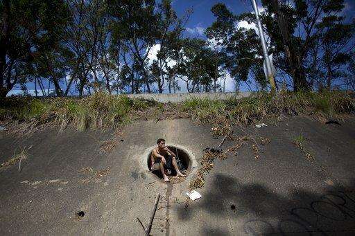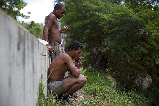 In this Dec. 5, 2017 photo, David Garcia, 19, smokes a cigarette while taking a break during his first week searching the polluted Guaire River for gold and anything valuable he can sell, as he sits on the edge of a drainage pipe, in Caracas, Venezuela. The father of a 4-month-old baby, Garcia said when work dried up organizing block parties he started reselling food he bought after waiting hours in line at grocery stores, but eventually that didn't bring him enough income to feed his family either, so he turned to the river. (AP Photo/Ariana Cubillos)