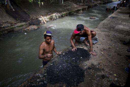 In this Dec. 5, 2017 photo, Angel Villanueva, right, looks for pieces of gold and other valuables in the debris he scooped up from the bottom of the polluted Guaire River, alongside other scavengers, in Caracas, Venezuela. As the 25-year-old scavenges alongside his friends, he's mindful that flash flooding leaves just minutes to get out, or be washed away to his death. Villanueva said he buys food with the money he earns that comes from selling what he finds in the river. (AP Photo/Ariana Cubillos)