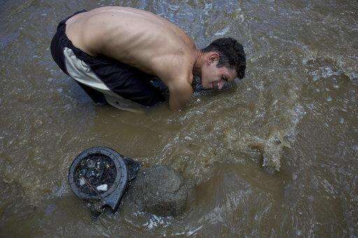 In this Nov. 30, 2017 photo, Douglas searches for gold and anything valuable he can sell, in the polluted Guaire River in Caracas, Venezuela. The river is a notorious outlet for rainwater from the streets, sewer and industrial waste. (AP Photo/Ariana Cubillos)