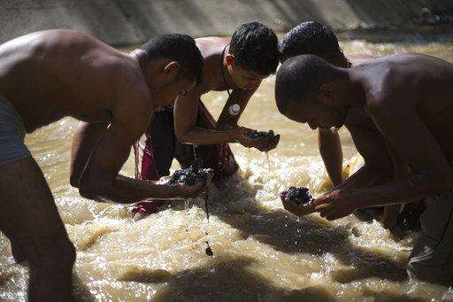 In this Nov. 30, 2017 photo, men sort through the debris they pulled up from the bottom of the polluted Guaire River, in search of pieces of gold and anything of value to sell in Caracas, Venezuela. Venezuela sits atop the world's largest oil reserves, but the global drop in crude prices and plummeting production under nearly two decades of socialist rule has left many in the country of 30 million people struggling to survive. (AP Photo/Ariana Cubillos)