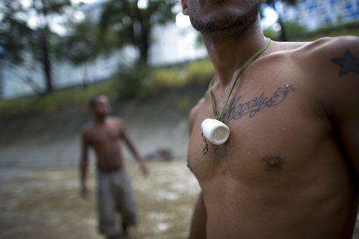 In this Dec. 5, 2017 photo, a medicine bottle hangs from a river scavenger's neck, where he keeps the small pieces of gold and other precious metals he finds on the bottom of the polluted Guaire River, in Caracas, Venezuela. A surge of young men and boys turn each day to the Guaire for survival in Venezuela's deepening crisis, scavenging from the river that runs the distance of Caracas. (AP Photo/Ariana Cubillos)