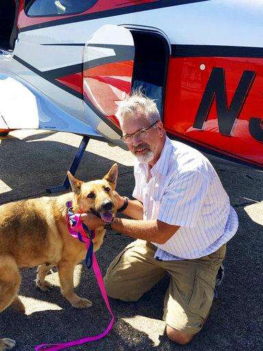 This June 6, 2016, photo provided by Best Fur Friends Rescue, shows Dr. Bill Kinsinger, with Jojo, a dog from Fort Worth Animal Care & Control, at a regional airport in northern Illinois. Officials said Thursday, Jan. 4, 2018, that Kinsinger, a doctor volunteering for a dog rescue operation who failed to land his small plane at an airport in Central Texas as planned and was later tracked by fighter jets flying over the Gulf of Mexico appeared unresponsive and may have been suffering from a lack of oxygen. A Federal Aviation Administration spokesman said the plane kept flying and was last observed on radar 219 miles northwest of Cancun, Mexico, flying at 15,000 feet. Kinsinger took off from Wiley Post Airport in Oklahoma City Wednesday afternoon after filing a flight plan to land in Georgetown, Texas. (Best Fur Friends Rescue via AP)