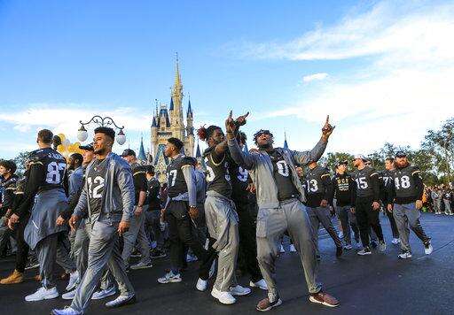 Central Florida football players celebrate during the a parade at Walt Disney World in the Magic Kingdom on Sunday, Jan. 7, 2018, in Orlando, Fla. (Jacob Langston/Orlando Sentinel via AP) The Associated Press