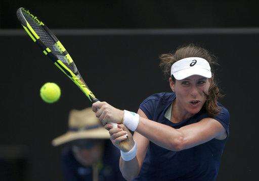 Johanna Konta of Britain hits a backhand to Agnieszka Radwanska of Poland during their women's singles match at the Sydney International tennis tournament in Sydney, Tuesday, Jan. 9, 2018. (AP Photo/Rick Rycroft) The Associated Press