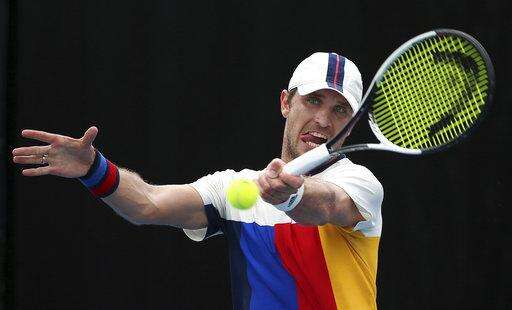 Germany's Mischa Zverev hits a forehand to Leonardo Mayer of Argentina during their match at the Sydney International tennis tournament in Sydney, Tuesday, Jan. 9, 2018. (AP Photo/Rick Rycroft) The Associated Press