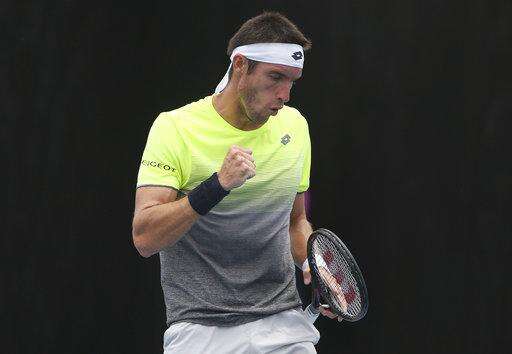 Leonardo Mayer of Argentina celebrates winning a point against Germany's Mischa Zverev during their match at the Sydney International tennis tournament in Sydney, Tuesday, Jan. 9, 2018. (AP Photo/Rick Rycroft) The Associated Press