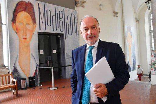 In this photo taken on June 5, 2017, Rudy Chiappini, art critic and curator of a Modigliani exhibition poses at the Ducal Palace in Genoa, Italy. Consumer advocates in Italy are demanding refunds after an expert ruled that almost all the paintings featured in a Genoa art exhibition on Amedeo Modigliani were fakes. The Italian news agency ANSA reported Tuesday that the expert, appointed by a Genoa court during a prosecutorâs probe, concluded that at least 20 of 21 paintings displayed during the Ducal Palace exhibit in 2017 were clearly fakes. (Luca Zennaro/ANSA via AP)