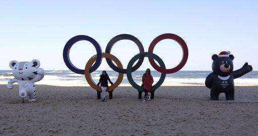FILE - In this Oct. 30, 2017, file photo, the Olympic Rings, Winter Olympic Games' official mascots, white tiger Soohorang, left, for the Olympics, and black bear Bandabi for Paralympics, are placed at the Gyeongpodae beach, in Gangneung, South Korea. The Olympics are actually being held in three areas: Pyeongchang, known for mountains and winter sports; Jeongseon, a blue-collar former mining region; and Gangneung, the biggest of the three Olympic towns by far and a bustling port and vacation area along the Sea of Japan, known here as the East Sea. (AP Photo/Ahn Young-joon, File)