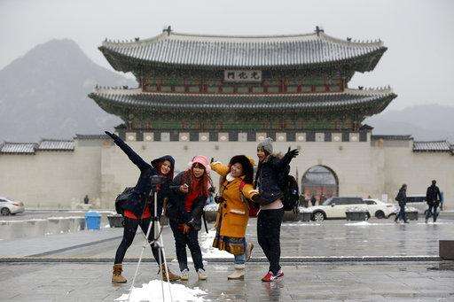 FILE - In this Dec. 3, 2014, file photo, visitors from Thailand pose for their souvenir photos in snowy weather near the Gwanghwamun, the main gate of the 14th-century Gyeongbok Palace and also one of South Korea's well known landmarks in Seoul, South Korea. South Korea is one of the safest places in the world to live and visit. The Pyeongchang Olympics are coming to a remote, ruggedly beautiful part of South Korea known for icy wind, towering granite mountains and a tough, proud population waiting to welcome foreign hordes. (AP Photo/Lee Jin-man, File)