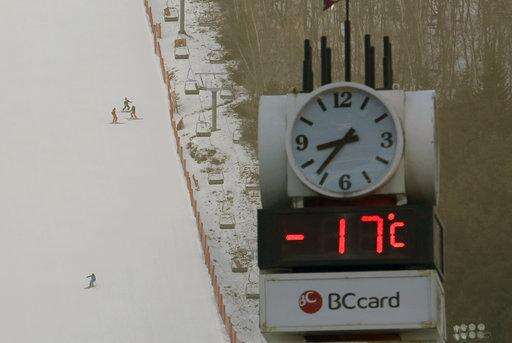 In this Dec. 12, 2017, photo, a thermometer shows the current outdoor temperature reaching minus 17 degrees Celsius (1.4 degrees Fahrenheit) as people play ski in the morning at Yongpyong Resort in Pyeongchang, South Korea. The Winter Olympics are actually being held in three areas: Pyeongchang, known for mountains and winter sports; Jeongseon, a blue-collar former mining region; and Gangneung, the biggest of the three Olympic towns by far and a bustling port and vacation area along the Sea of Japan, known here as the East Sea. (AP Photo/Ahn Young-joon)