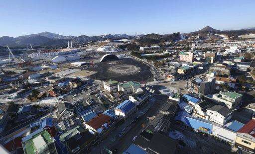 In this Dec. 12, 2017, photo shows overview of the Pyeongchang town, South Korea. The Pyeongchang Olympics are actually being held in three areas: Pyeongchang, known for mountains and winter sports; Jeongseon, a blue-collar former mining region; and Gangneung, the biggest of the three Olympic towns by far and a bustling port and vacation area along the Sea of Japan, known here as the East Sea. (AP Photo/Ahn Young-joon)