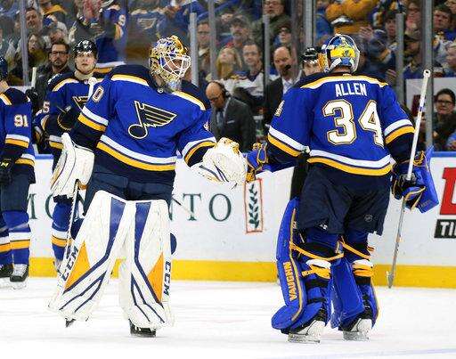 St. Louis goaltender Jake Allen stopped 18 of 23 shots before he was replaced by Carter Hutton, who finished with 11 saves.