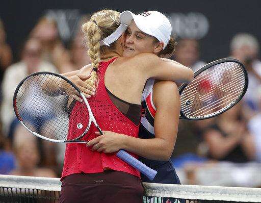 Angelique Kerber of Germany, left, hugs Ash Barty of Australia at the end of their women's final singles match at the Sydney International tennis tournament in Sydney, Saturday, Jan. 13, 2018. Kerber won the match. (AP Photo/Rick Rycroft) The Associated Press